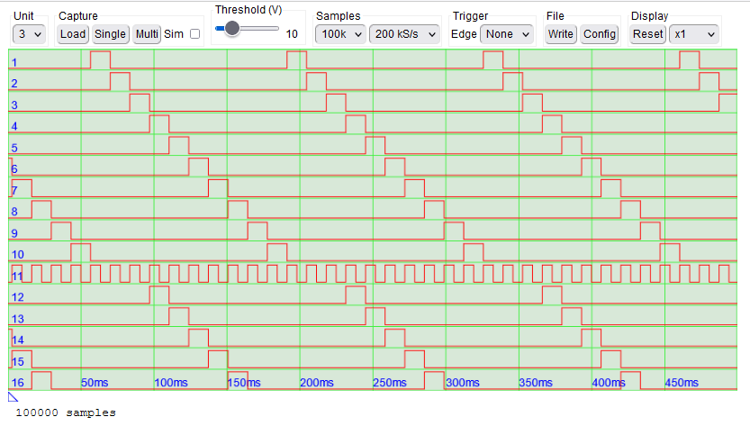 In a previous post, I experimented with shader hardware (via WebGL) for quickly displaying the logic analyser traces in a Web page. Whilst this technique can provide really fast display updates, there were some browser compatibility problems, and also a pure-javascript version proved to be fast enough, given that the main constraint is the time taken to transfer the data over the network.